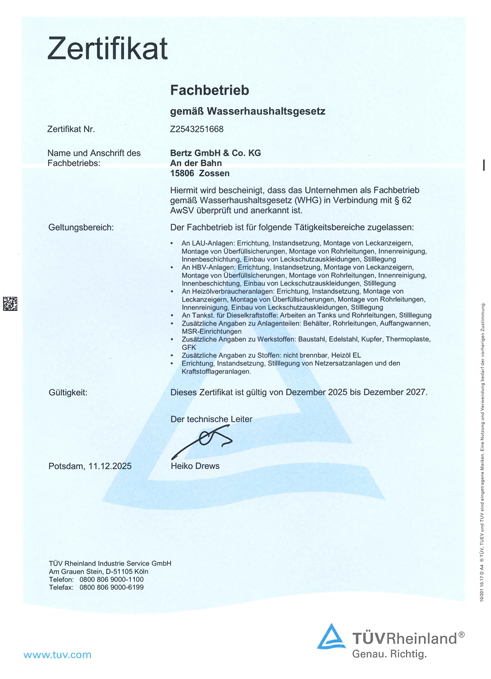 WHG Zertifikat Fachbetrieb nach Wasserhaushaltsgesetz