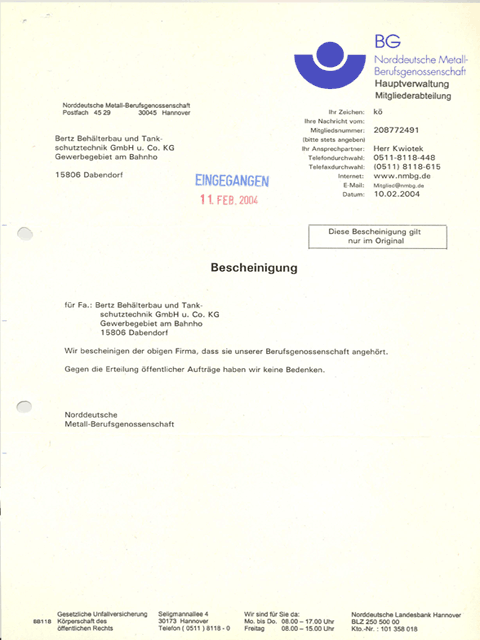 Mitgliedschaft Norddeutsche Metall-Berufsgenossenschaft