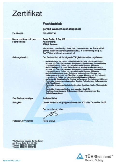WHG Zertifikat Fachbetrieb nach Wasserhaushaltsgesetz